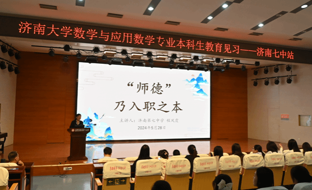 此次活动还是数学与应用数学专业本科生的一次教育见习活动。揭牌仪式之后,程凤霞老师为来访的数学与应用数学专业本科生做了题为《“师德”乃入职之本》的讲座,结合具体案例,从爱国守法、爱岗敬业、关爱学生、教书育人、为人师表、终身学习等六个方面,分享了自己对于师德养成的认识和做法。程凤霞老师通过随机采访、榜样案例、教育妙招等系列形式,幽默生动地阐述了一位好老师的具体标准,让大家体会到了高尚的师德对教育工作者的意义和重要性,获得与会者的高度认同。讲座后,李静主任带领买球官方网站的师生参观了济南七中校园。