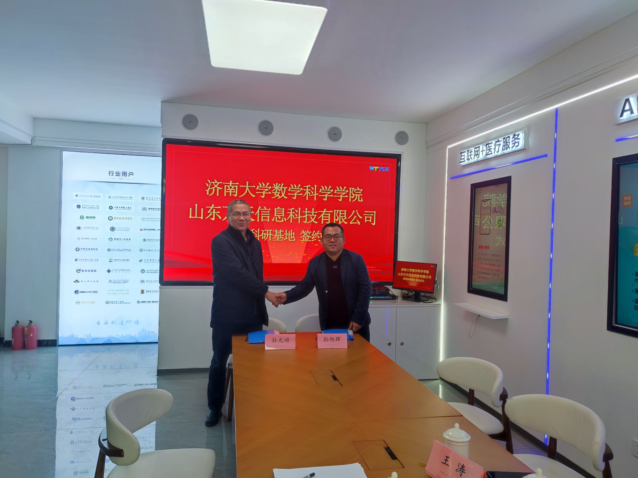 孙元功与山东万天信息科技有限公司董事长孙旭会签署战略合作协议,并为基地揭牌,活动由山东万天信息科技有限公司副总经理生训刚主持。