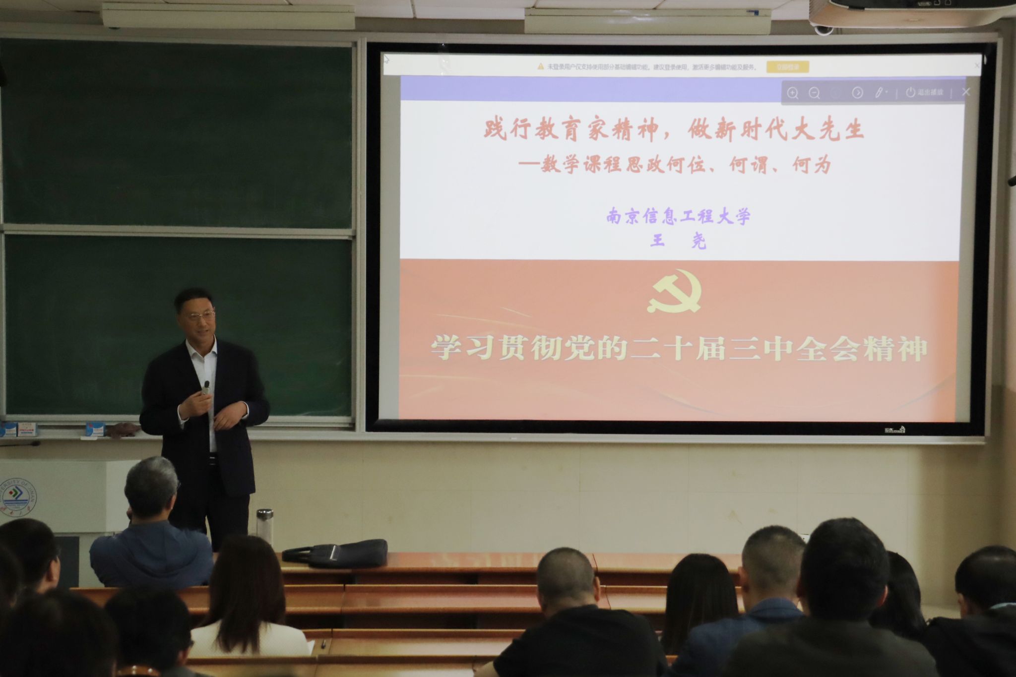 为贯彻落实立德树人根本任务,深入推动买球官网“课程思政”建设走深走实,全面提升人才培养质量,5月6日下午,南京信息工程大学原党委副书记、副校长,博士生导师王尧教授来院为师生作题为“弘扬教育家精神,做新时代大先生——数学课程思政何位、何谓、何为”的专题报告。学院全体领导班子成员及全体教职工参加会议,会议由学院党委书记崔英静主持。
