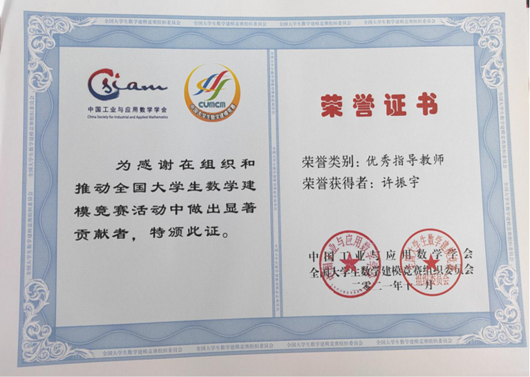 许振宇老师从2003年开始参加建模竞赛培训工作。2006年起担任买球官方网站数学建模指导中心主任,全面负责数学建模竞赛培训工作,并担任主讲教师,带领建模团队教师,大胆探索改革培训模式,编写校内培训讲义,细化培训流程,改进模拟训练阶段教师指导方法,强化建模竞赛宣传工作,指导学生建模协会工作,创办买球官方网站数学建模竞赛,使数学建模成为济大在省内的一张靓丽的名片。指导的学生在“高教社杯”全国大学生数学建模竞赛中获得全国一等奖1项,全国二等奖8项,赛区一等奖28项,赛区二、三等奖34项;在“中国电机工程学会杯”全国大学生数学建模竞赛中获得全国一等奖3项。2010年、2013年,两次被评为“全国大学生数学建模竞赛山东赛区优秀指导教师”。2011年以来,连续担任山东赛区论文评审专家。2011年、2015年两次担任全国奖评审专家。