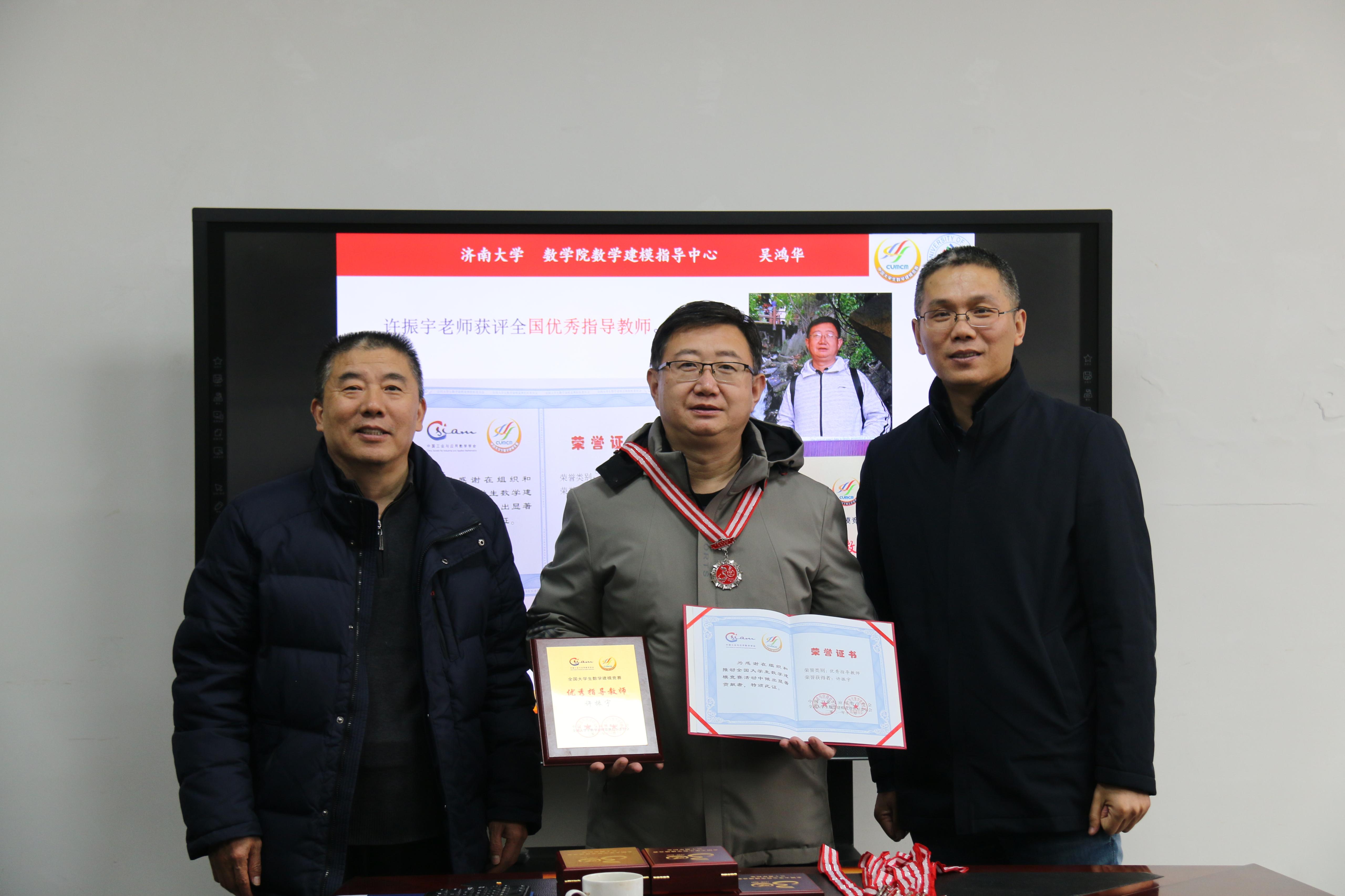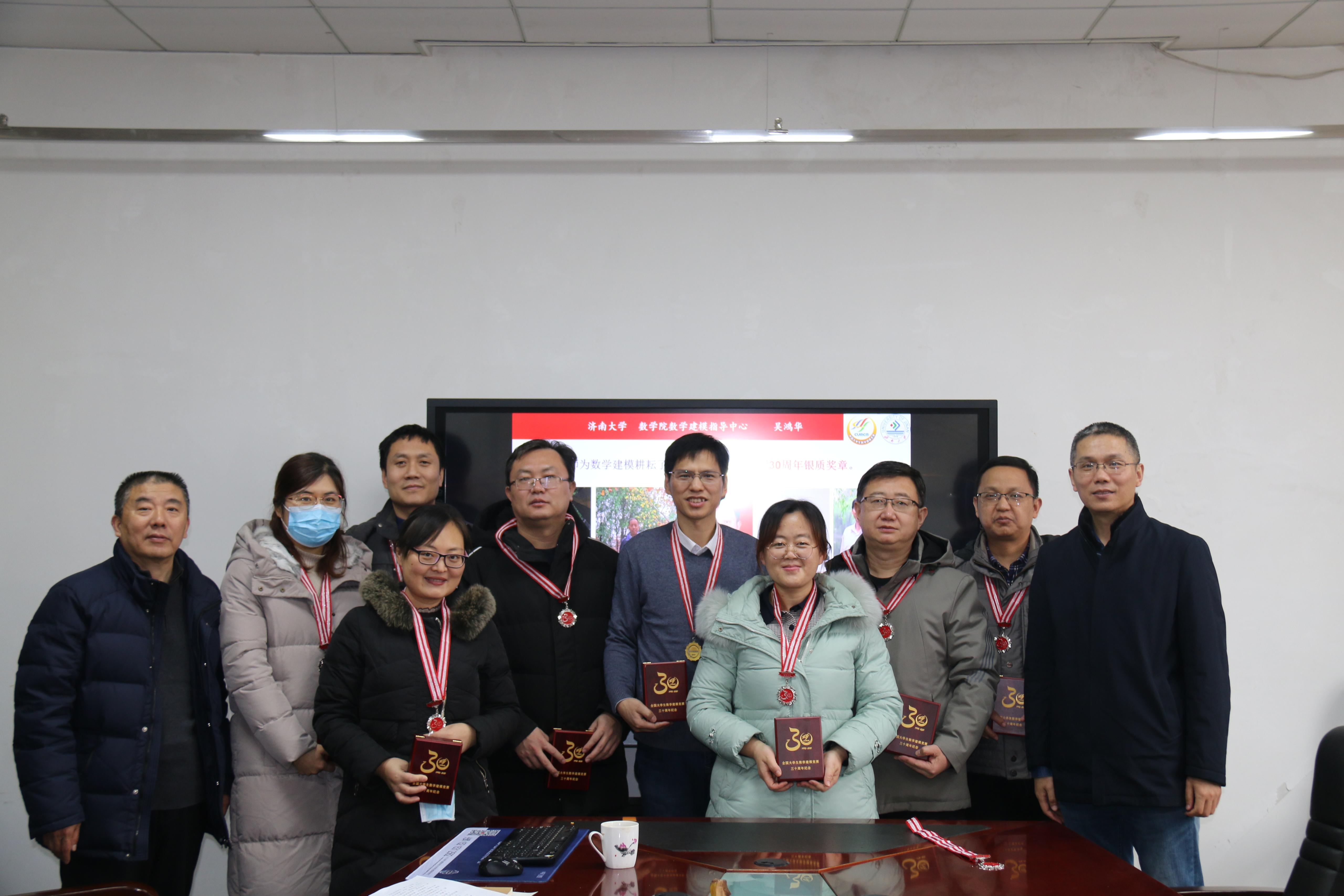 会上,学院党委书记侯启海、学院院长孙元功分别为全国大学生数学建模竞赛优秀指导教师获得者许振宇老师颁发了证书和奖牌,为数学建模默默耕耘15年及以上的许振宇、吴鸿华、孙鹏举、邱保建、李尚友、刘春燕、刘艳、屈忠锋、何燕玲等9位老师颁发了全国数学建模竞赛30周年银质奖章。