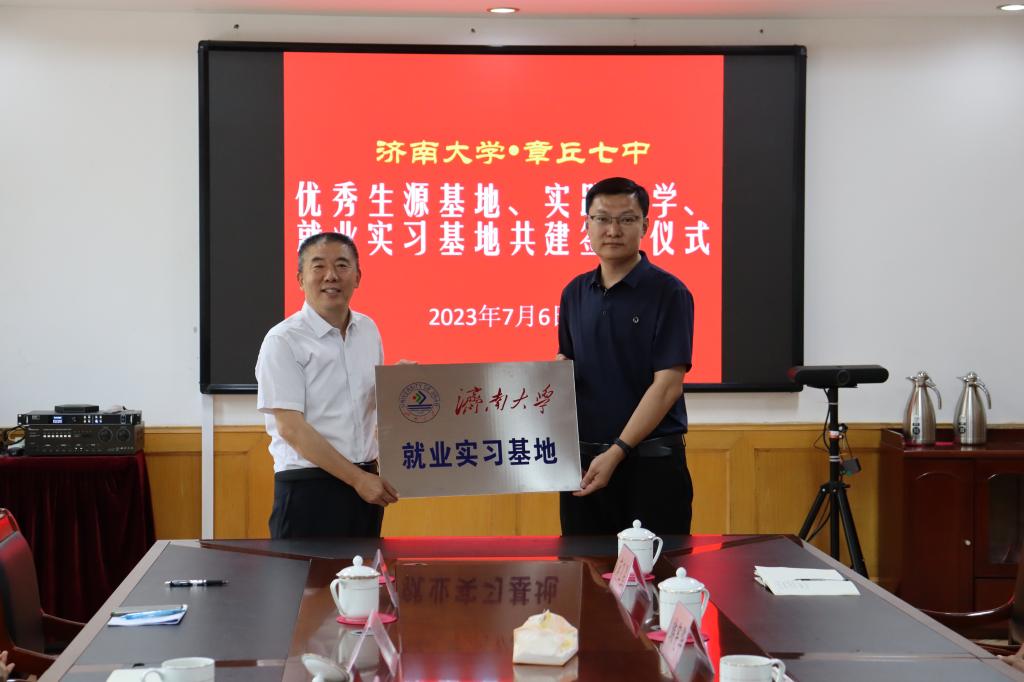 为深入推进学习贯彻习近平新时代中国特色社会主义思想主题教育广泛开展,7月6日,教务处、买球官方网站一行5人赴章丘第七中学举行买球官方网站优秀生源基地、实践教学基地、就业实习基地签约授牌仪式。章丘教研中心副主任于学,章丘第七中学校长毕延军,买球官方网站教务处副处长兼师范教育管理办公室主任张婷,买球官方网站党委书记侯启海、党委副书记张沂红,以及买球官方网站学办、数学与应用数学系主任参加活动。
