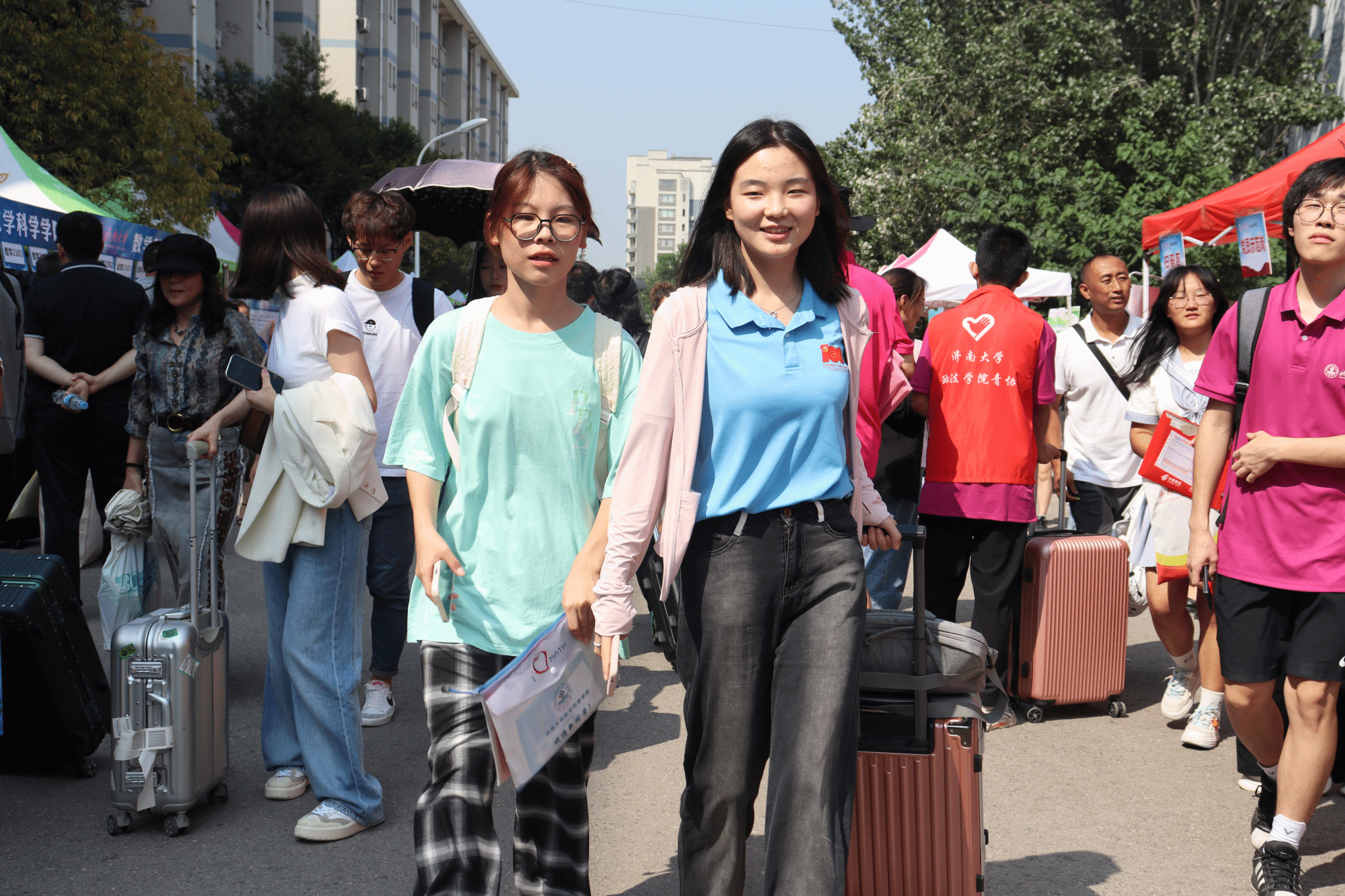 “辰星有灿,‘数’与为伴!心中有‘数’,勇走‘新’路!”等一条条激情昂扬、温暖人心的条幅承载着真挚的情谊,变成连接学院和新生的桥梁。学生志愿者和引导人员等工作人员热情讲解、耐心指引、引导带路、搬运行李等,“同学,宿舍楼在这边,请跟我来”、“同学,行李我帮你拿”……一句句暖心的话语,一双双伸来援助的手,帮助新同学们顺利完成报到,让大家安心入学、舒心生活。