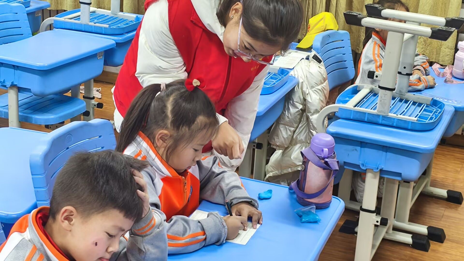 授课现场,志愿者为同学们准备了橡皮泥、纸笔等实用性授课道具以便同学们独立思考、动手实践。活动伊始,志愿者通过展示自然现象及经典建筑的对称之美,向同学们介绍了轴对称概念,使同学们直观感受到对称轴的神奇,由此开启了同学们对数学和美学融合认知的奇妙之旅。为加深同学们对知识的掌握,志愿者以提问的方式引导同学们独立思考。同学们纷纷举手,踊跃回答,现场气氛十分活跃。随后,志愿者利用简单的链条模型,模拟出悬链线形状,并结合生活中的具体实例向小朋友讲解,使他们明白这一曲线在建筑力学中的重要意义。此外,志愿者通过常见的雪花图案引出分形的概念,志愿者拿出自制的分形图案卡片,引导小朋友观察局部和整体的相似性。在最后的互动环节中,小朋友们分组讨论,用手中的橡皮泥等材料创造“建筑美”,志愿者在旁耐心指导,鼓励小朋友们发挥想象。