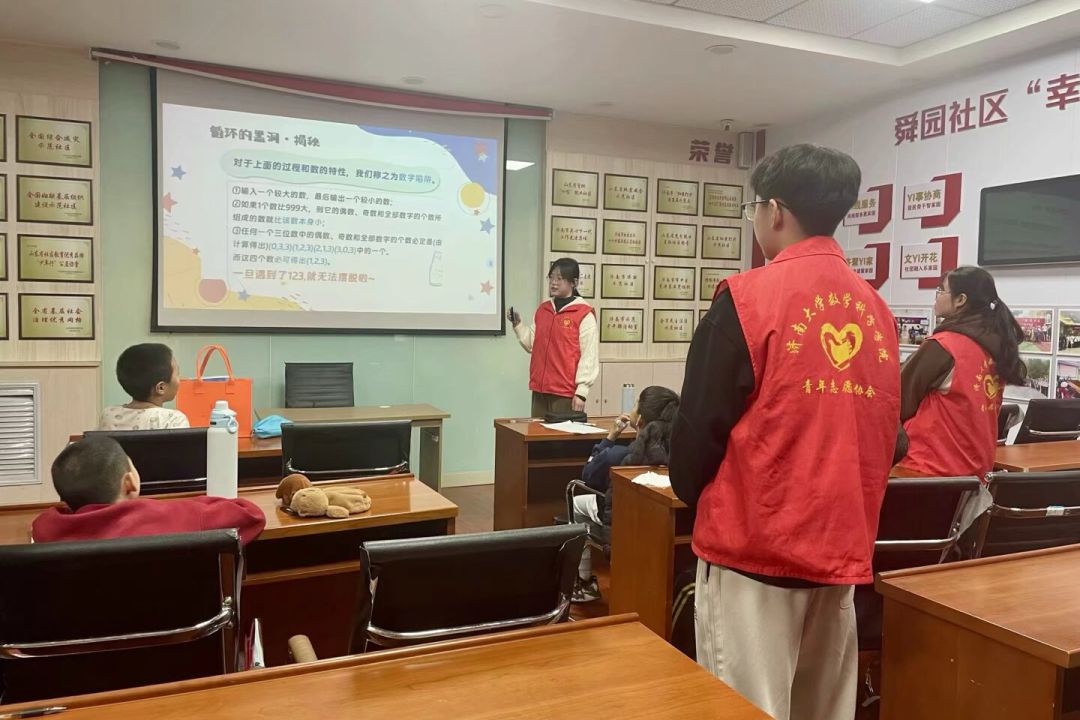 为激发社区少年儿童对数学的兴趣,培养同学们的逻辑思维能力,买球官方网站学生会青年志愿者协会组织志愿者于 3月1日在济南舜园社区开展趣味数学的授课活动。活动伊始,志愿者带领同学们玩起"遇7击掌"热身游戏,清脆的掌声与欢笑声瞬间点燃课堂,为这场思维探险注入满满活力。随后,志愿者通过兔子生崽趣味谜题引出斐波那契数列的奥秘,配合动画演示,使数列规律显然可见。此外,志愿者与同学们进行 “我会读心术”、“循环的黑洞” 等小游戏,将课堂气氛推向高潮,在欢乐中结束了本次趣味数学之旅.