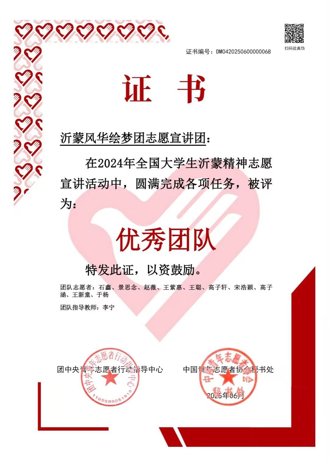 近日,团中央青年志愿者行动指导中心、中国青年志愿者协会秘书处联合表彰2024年全国大学生沂蒙精神志愿服务团队,买球官方网站“沂蒙风华绘梦团”志愿宣讲团在1000支大学生志愿服务团队中脱颖而出,荣获“优秀团队”称号。