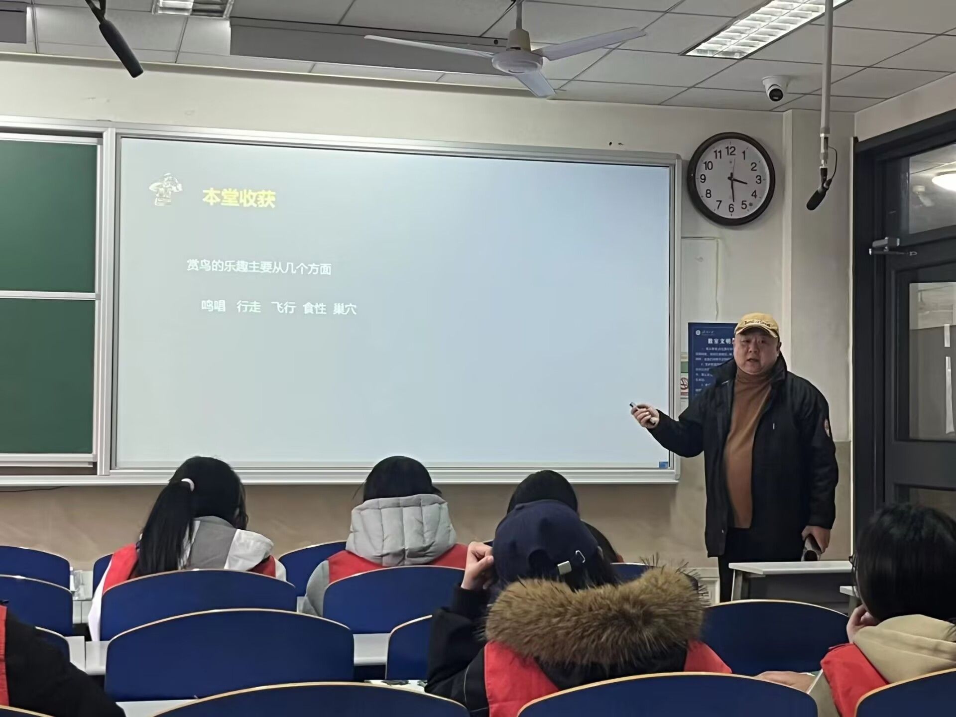活动伊始,志愿者们在户外开展实践学习。指导老师讲解无痕观鸟原则,演示望远镜使用方法,并简要介绍校园常见鸟类。随后,同学们在老师带领下实地观察校园鸟类,将理论知识与自然景象相结合,感受生物多样性。户外环节结束后,全体志愿者返回室内,讲师介绍“鸟达人”小程序的使用方法,并围绕“寻鸟入境、观鸟获趣、识鸟知性、赏鸟品德、鸟达人入门”五个维度,系统讲解如何科学、文明地观察和理解鸟类,引导同学们从自然体验中领悟生态伦理,树立人与自然和谐共生的责任意识。