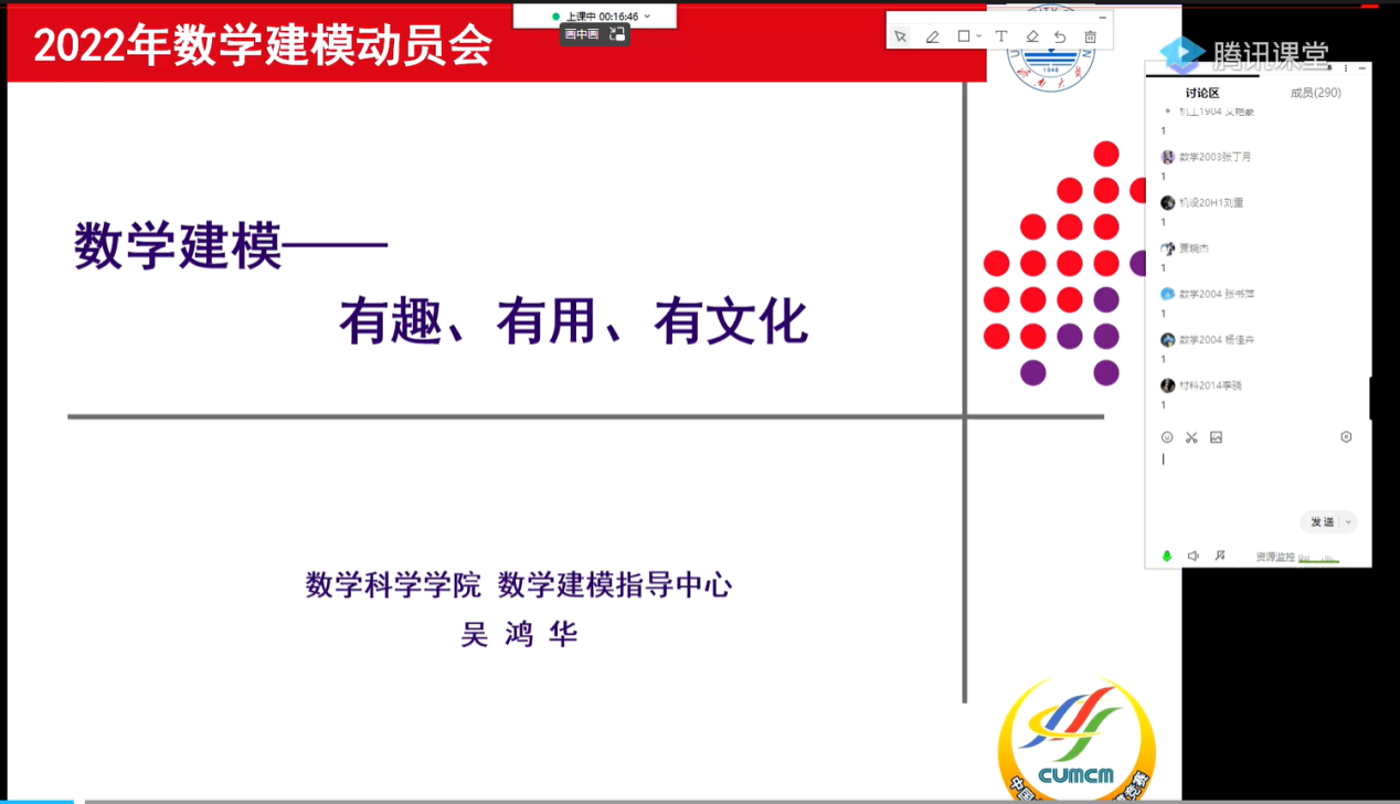 为助力我校学子了解数学建模、提高数学学习兴趣、培养数学应用实践能力,买球官方网站于3月15日下午线上举办了2022年大学生数学建模竞赛培训动员大会。本次大会由买球官方网站数学建模中心主任吴鸿华副教授主持,来自我校各院300余名优秀学子参加了会议。