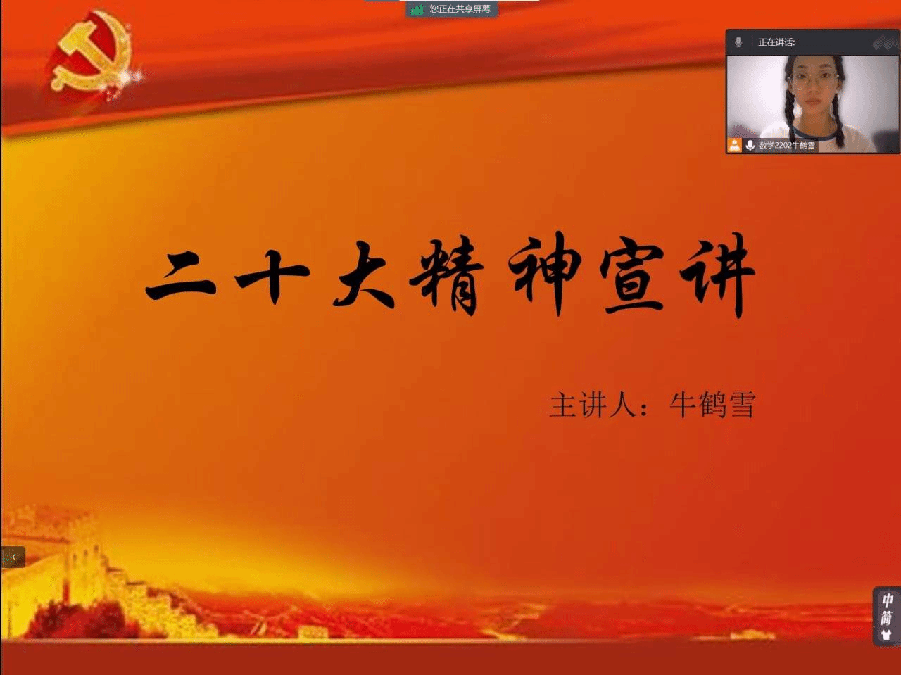 党和人民事业发展离不开一代又一代有志青年的奋斗奉献。为深入学习宣传贯彻党的二十大精神,号召广大青年坚定不移地听党话,跟党走,怀揣梦想又脚踏实地,以实践行动践行“请党放心,强国有我”的誓言,买球官方网站“党的二十大精神”宣讲实践队于7月24日至7月27日开展第三期线上宣讲实践活动。