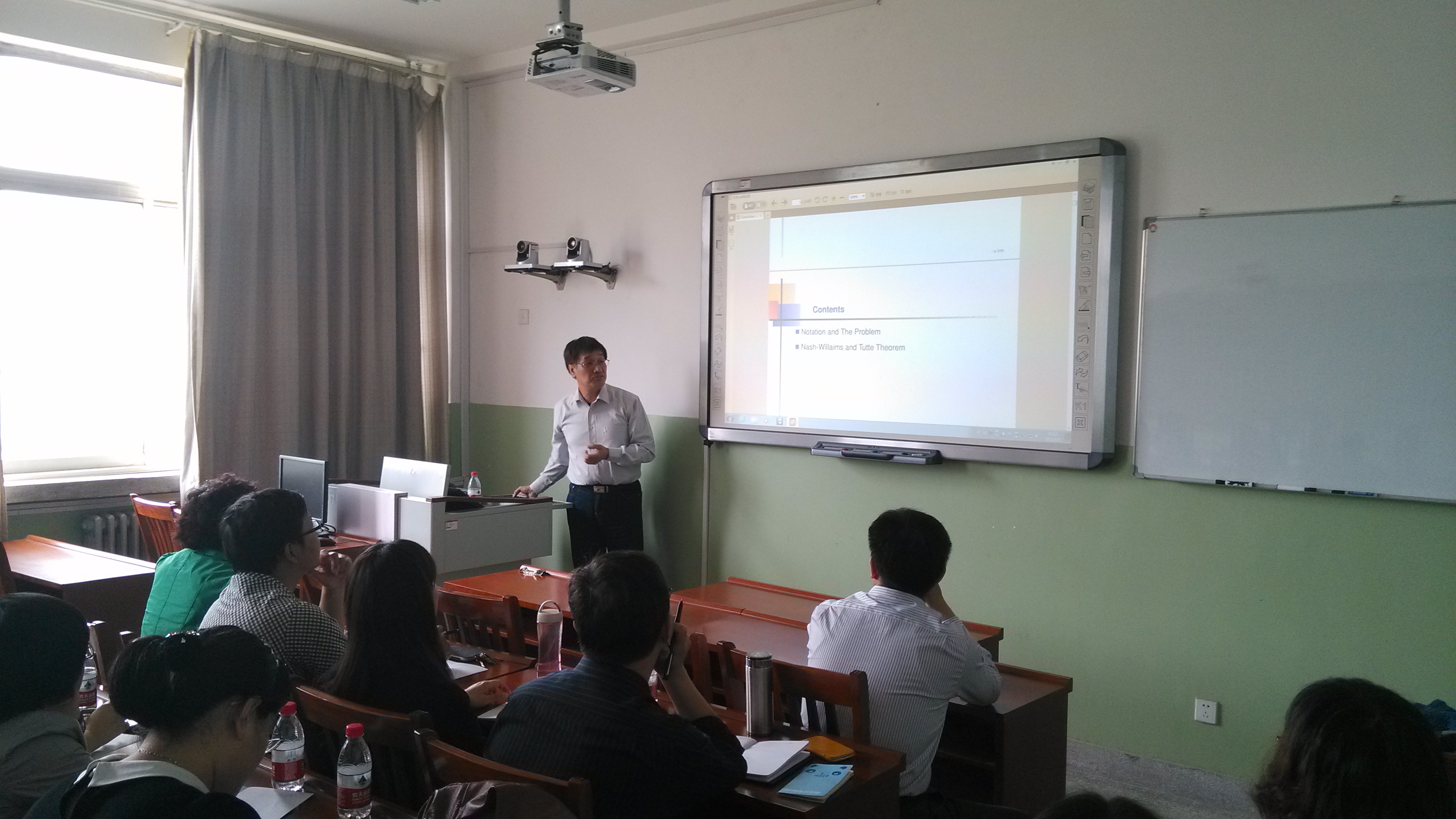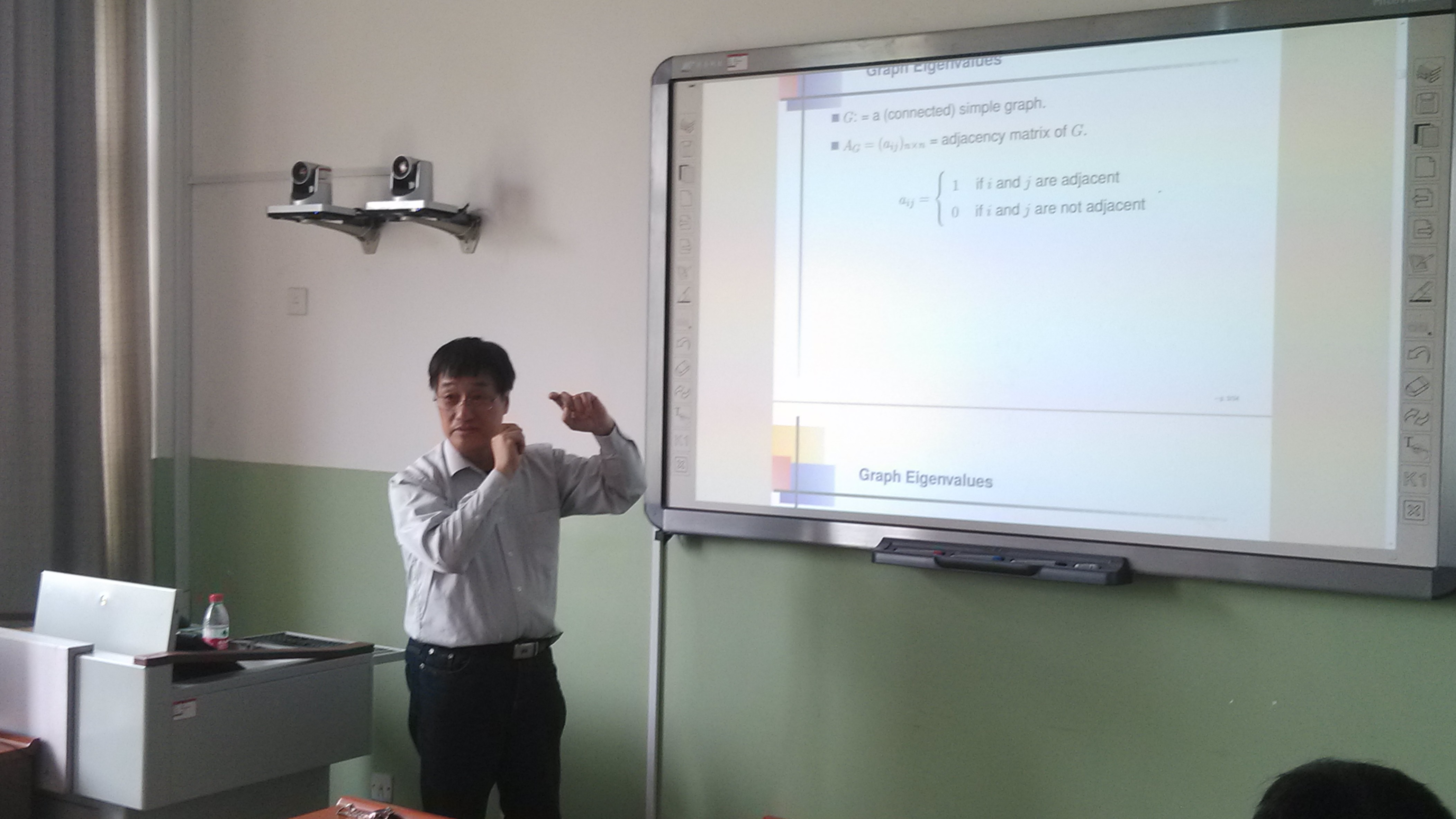 报告会上,赖虹建教授做了《图的边不交的支撑树与特征值》的报告。赖虹建教授从“图的边不交支撑树的个数与邻接矩阵特征值之间关系”的一个猜想出发,介绍了图的邻接矩阵、拉普拉斯矩阵和无符号拉普拉斯矩阵的概念和相关组合、代数方法,详细讲解了问题的研究思路和主要结果,并提出了进一步思考的一些问题。会后,买球官方网站图论与组合优化科研团队的师生们还就组合图论的一些前沿问题和国外研究现状与赖虹建教授进行了探讨和交流。