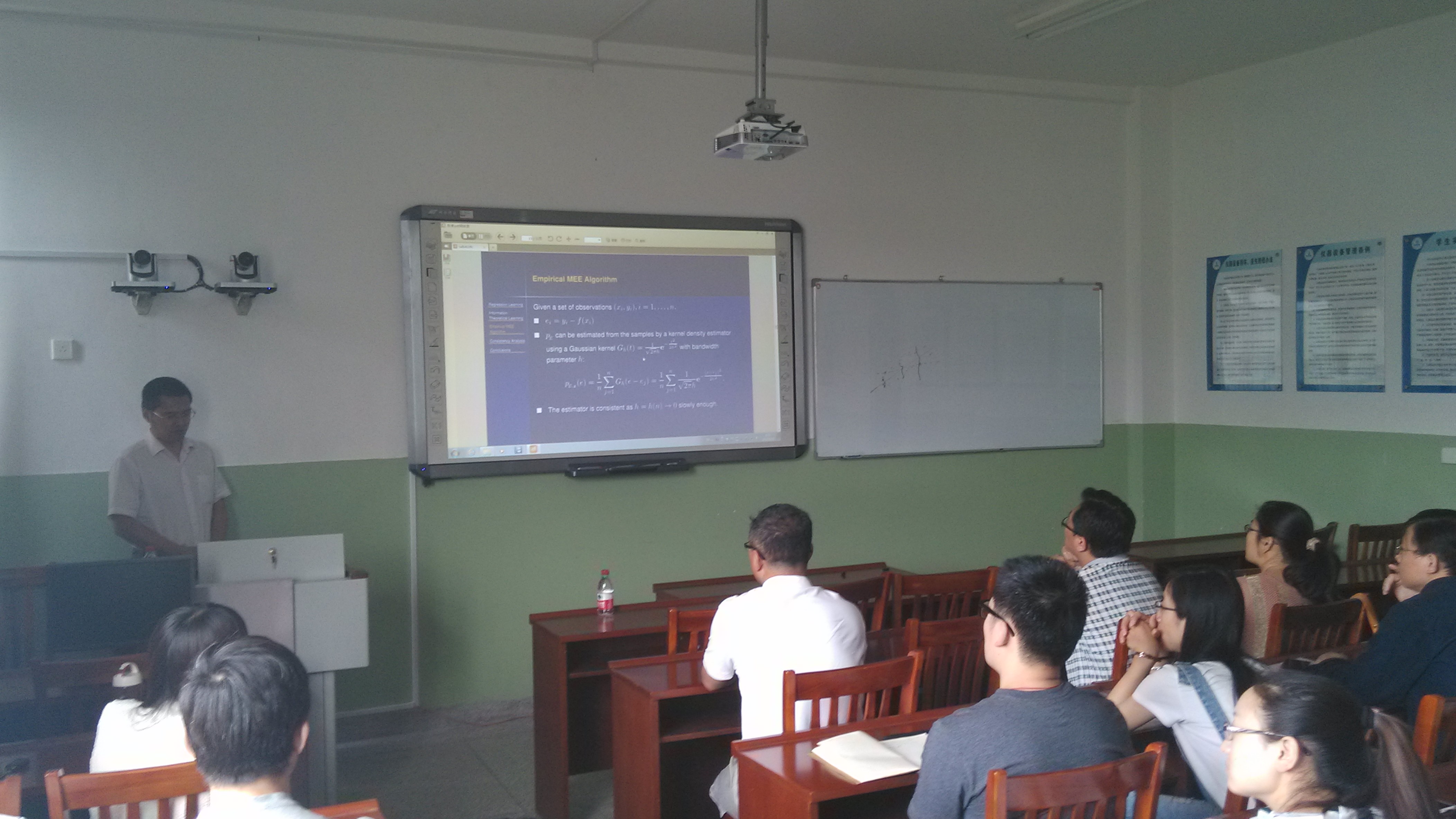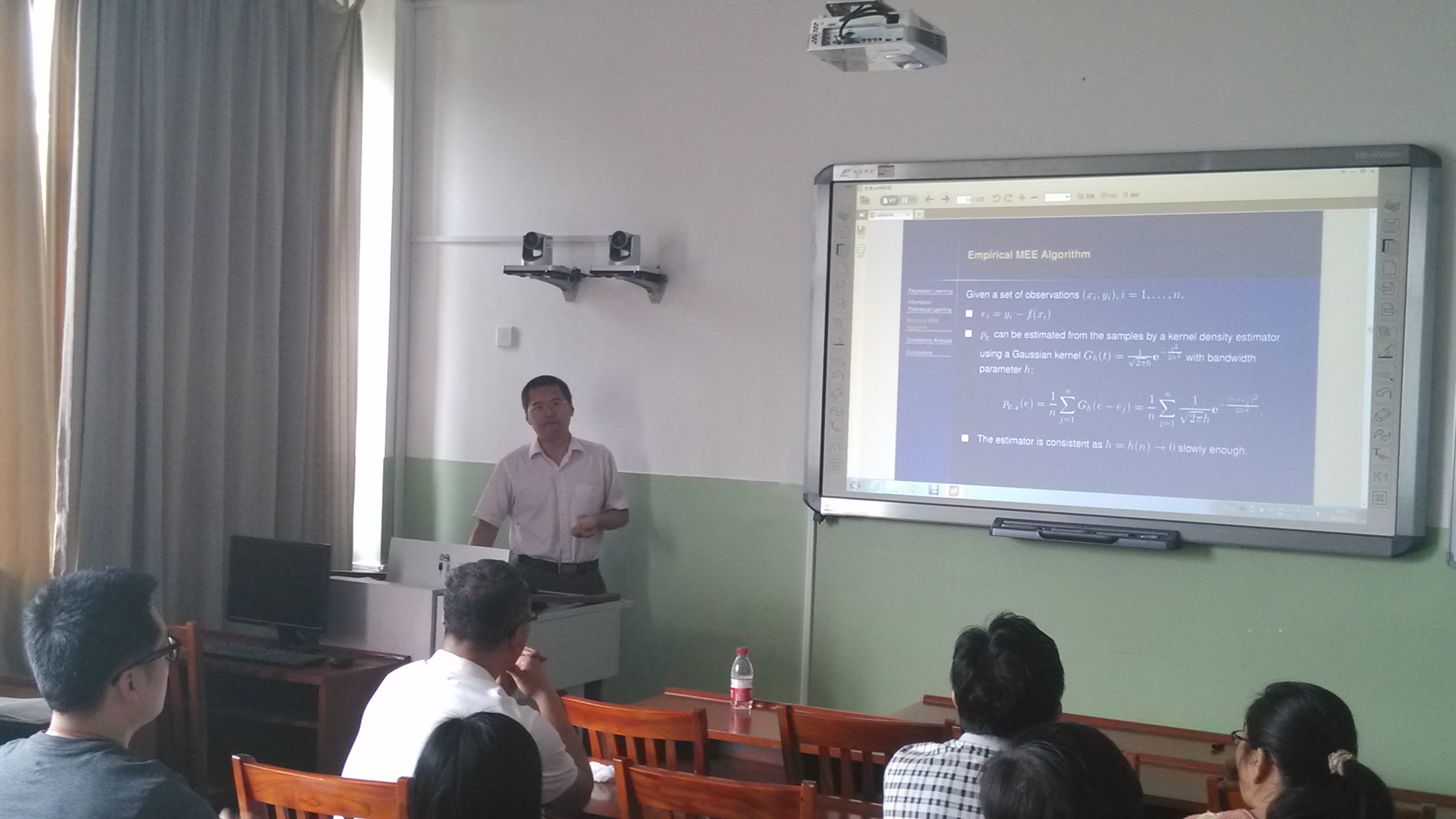 吴强博士的报告题目为《Consistency Analysis of the Minimum Error Entropy Algorithm》。报告中,吴强博士详细介绍了回归学习、基于信息论中Shannon熵与Renyi熵的MEE回归算法的由来、以及MEE回归算法的一致性分析,并提出了进一步思考的一些问题。会后,买球官方网站不确性数学理论科研团队的师生们还就学习理论的一些前沿问题和国外研究现状与吴强博士进行了探讨和交流。