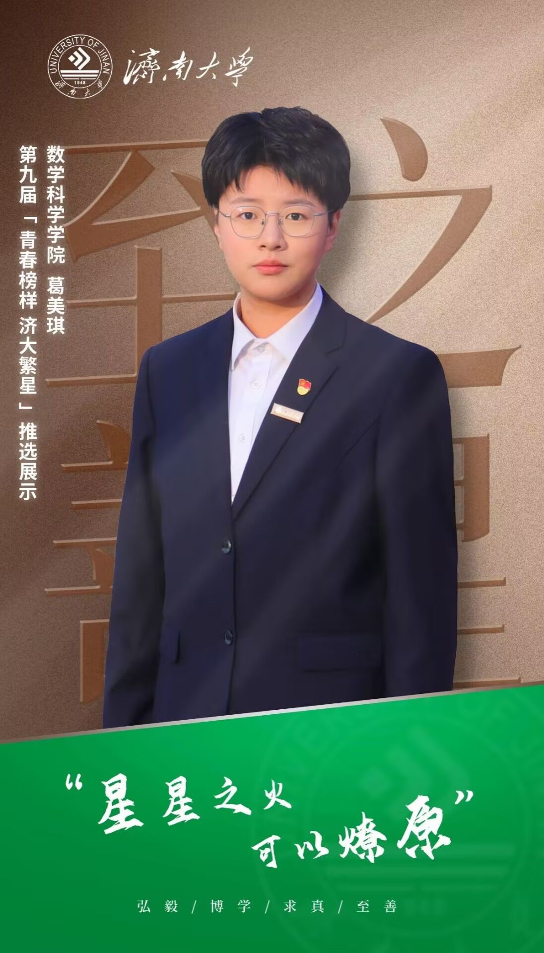 近日,买球官方网站第九届“青春榜样·济大繁星”推选展示活动结果揭晓,买球官网学子葛美琪凭借突出的表现与真挚的初心脱颖而出,获评“济大繁星”荣誉称号。她用行动诠释着“至善”的内涵,将青春的热忱融入学生工作与志愿服务的点滴之中,成为身边同学心中的榜样。