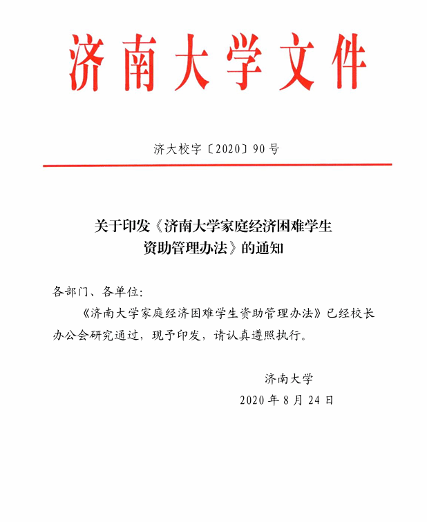 济大校字〔2020〕90号-关于印发《买球官方网站家庭经济困难学生资助管理办法》的通知